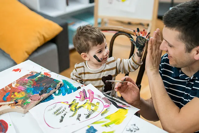 É hora de deixar voar a imaginação, as pinturas e as manchas ;) A criatividade não tem limites, certo? Ok, prepara uma mesa com várias folhas em branco. Esquece-te do lápis e dos marcadores e, pintem juntos... com as mãos. Uma explosão de cores, literalmente!