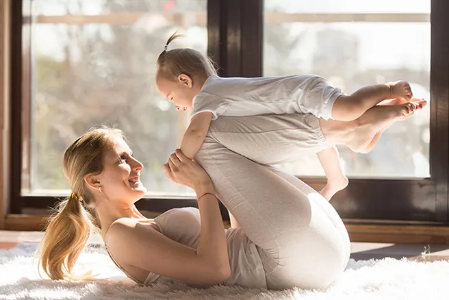 Dificuldade: ☆ ☆ ☆ ☆ (Adequado para bebés dos 6 aos 12 meses) 3,2,1… Descolamos! Coloca o teu bebé de bruços na parte exterior das tuas pernas, dos joelhos aos pés, e segura-o pelas mãos. De seguida, sobe e desce as pernas, aproximando do peito e depois afastando os joelhos. Volta a subir e a descer, subir e descer… Enquanto o teu pequenote estiver sentado no seu avião particular, tu estarás a fortalecer o abdómen e as pernas. Este é o voo que te põe em forma!