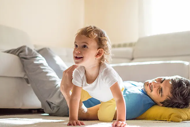 Dificuldade: ☆ ☆ ☆ (Adequado para bebés dos 8 aos 12 meses) Sempre te sentiste grande ao seu lado, mas agora serás o próprio Gulliver e o seu anãozito. Deixa que o teu bebé gatinhe por diferentes partes do teu corpo: pés, costas, braços ou serve-te do sofa para criar uma pista de obstáculos com as almofadas. Desta forma, o teu filho irá ganhar força nas mãos e nos pés enquanto trepa pelas montanhas. Uma exploração aventureira que ajuda a exercitar a coordenação e o equilíbrio!