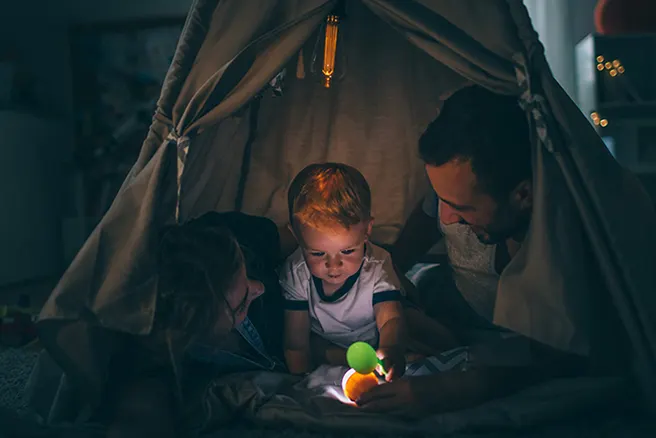 Montar um acampamento em casa pode ser super divertido! Escolhe um local da casa para construí-lo com o teu filhote. Vai buscar uns lençóis, algum convidado especial como o senhor peluche, e uma lanterna ou candeeiro. Brincar com as luzes no interior criará um ambiente especial, onde poderás contar histórias e, porque não, inventá-las?. Não é só criar um espaço. É criar o vosso pequeno refúgio.