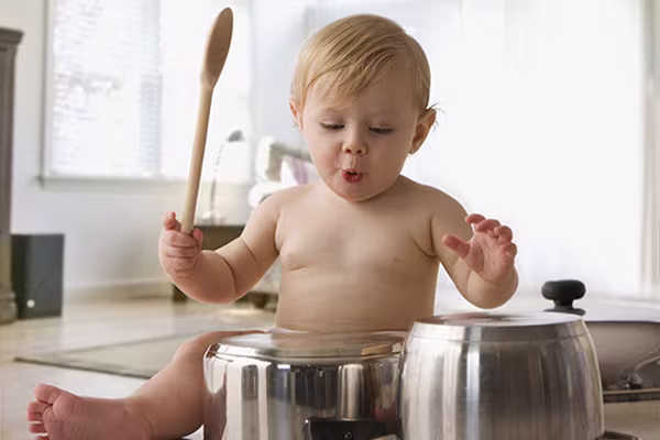 No armário da cozinha tem toda uma série de instrumentos musicais disfarçados de frigideiras e caçarolas, em que você e o seu filho têm apenas que bater ,os tachos para fazer imensos ruídos divertidos.